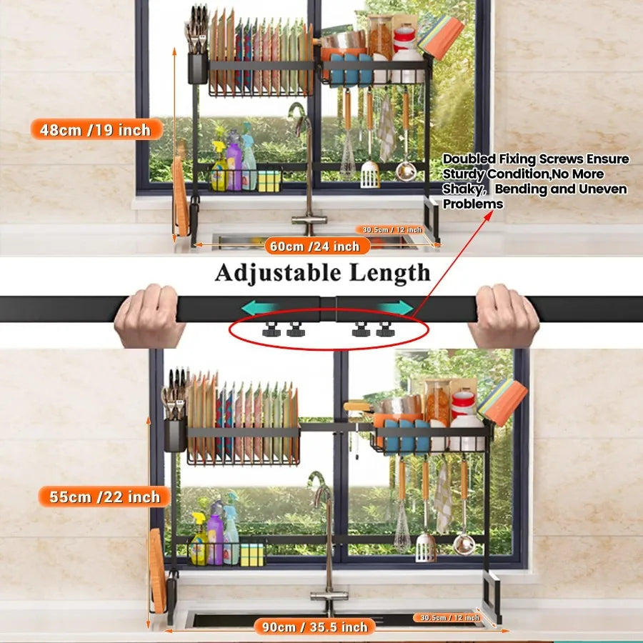 - Expandable length from 24" to 35.5" and adjustable height from 19" to 22" let you tailor the rack to your sink, faucet, and cabinet clearance.