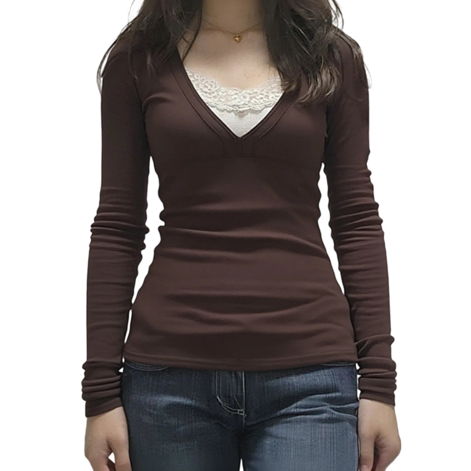 Women s Stylish V Neck Lace Patchwork Fit Long Sleeve Pullover Top for Fall Fashion Statement